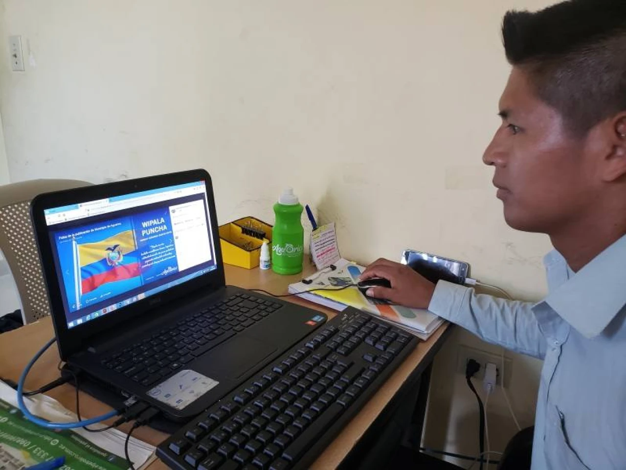 Él atiende a las personas que no hablan español y que utilizan su lengua ancestral. Así, les traduce y los guía a los sitios donde deben realizar los trámites en el Municipio de Aguarico, donde labora como intérprete del idioma kichwa.