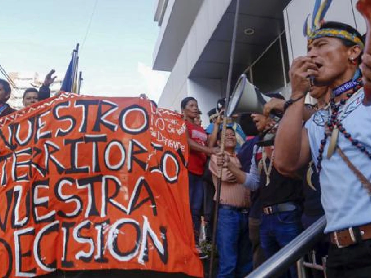 Integrantes de la etnia indígena waorani, de la Amazonía de Ecuador, realizaron este jueves 16 de mayo del 2019 una marcha en Quito para exigir que la justicia del país ratifique un fallo que admite la violación del mecanismo de consulta previa en la licitación de un proyecto petrolero en su territorio.